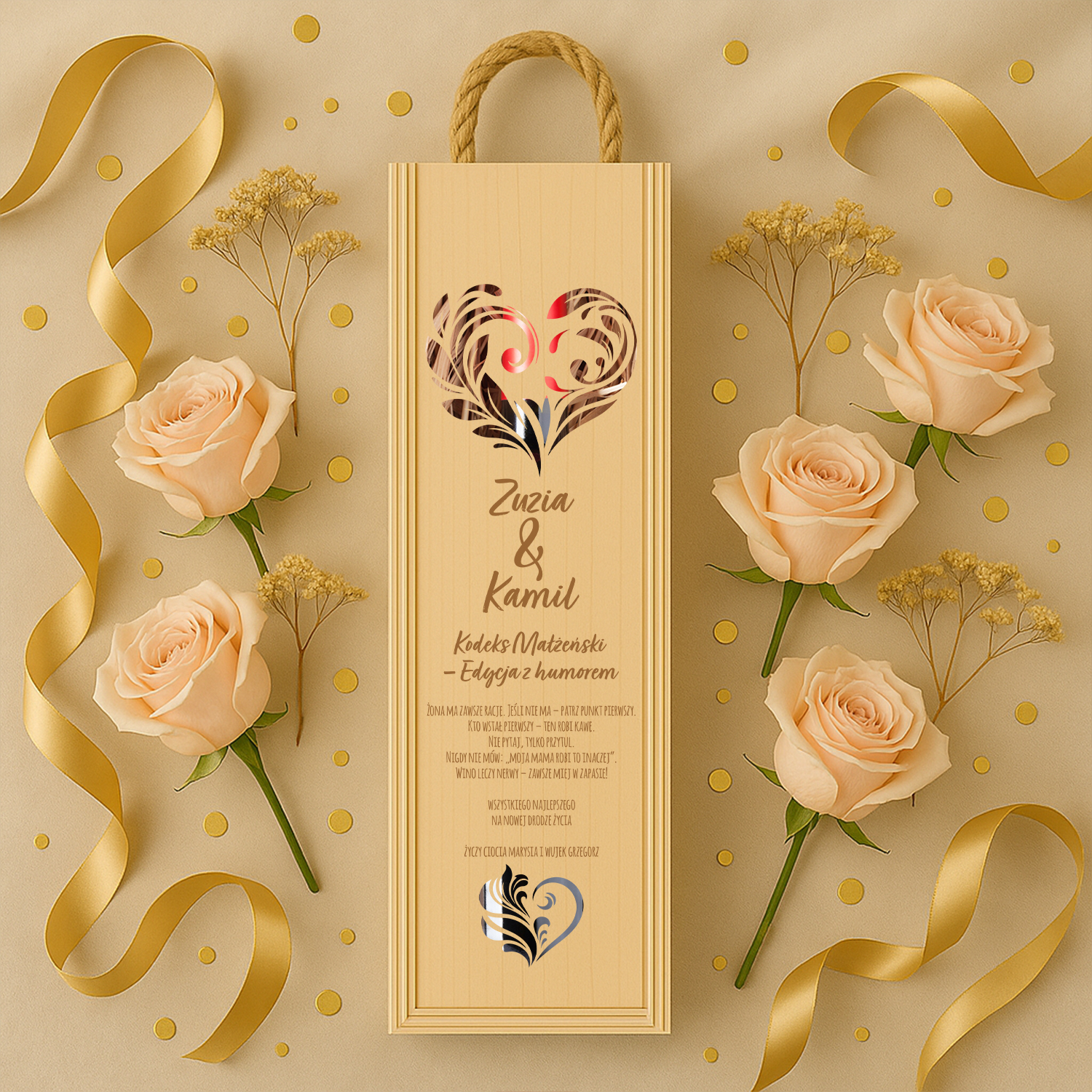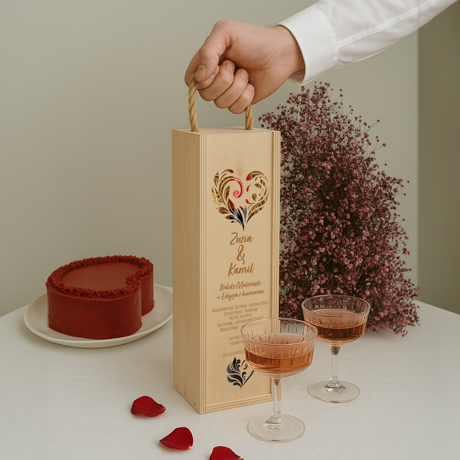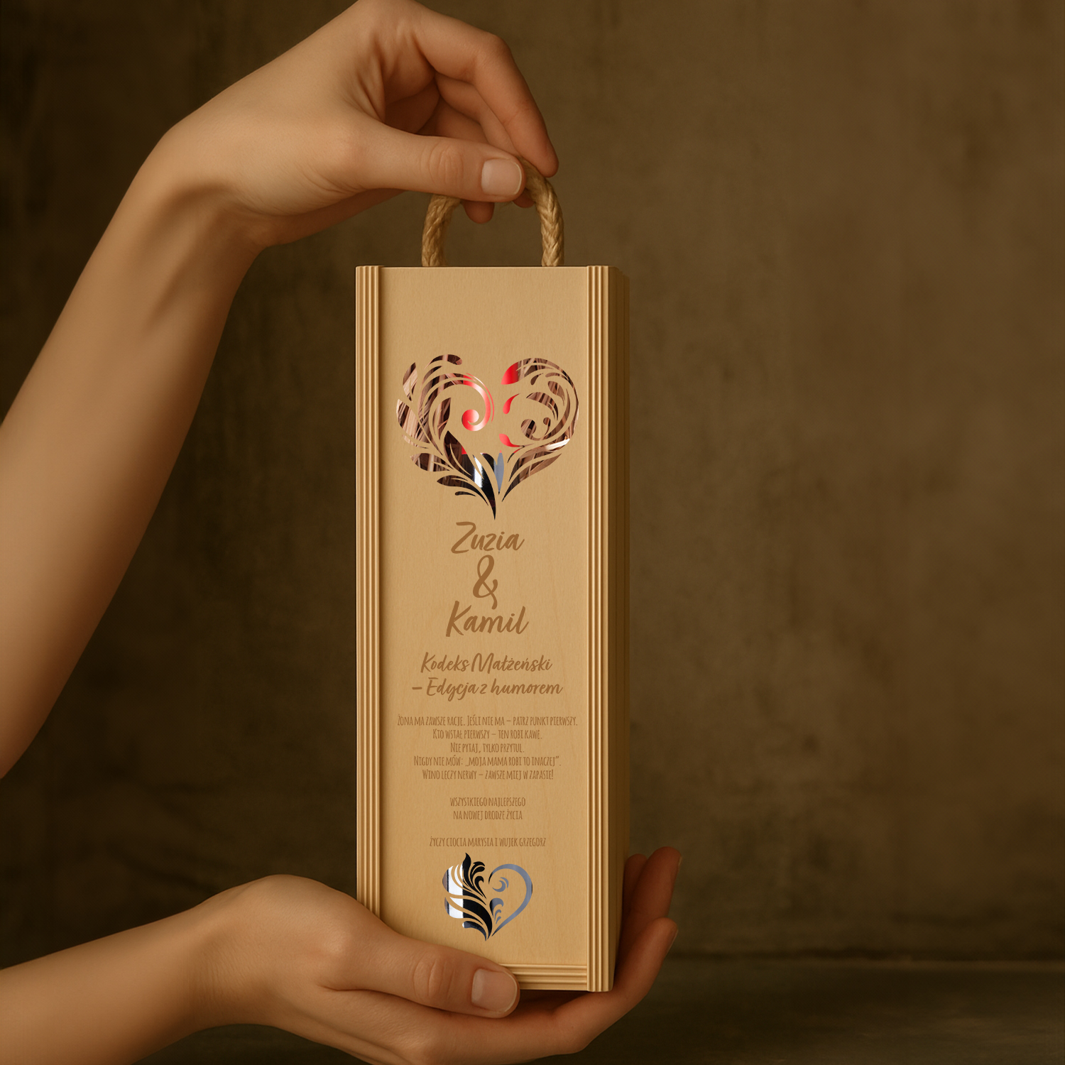 Skrzynka na wino z Kodeksem Małżeńskim to doskonałe połączenie stylu, humoru i personalizacji. Sprawdzi się jako prezent ślubny, rocznicowy lub pamiątka od serca. Dzięki ażurowemu wzorowi i zabawnym zasadom – ten upominek na pewno nie wyląduje w szufladzie! 🎁❤️