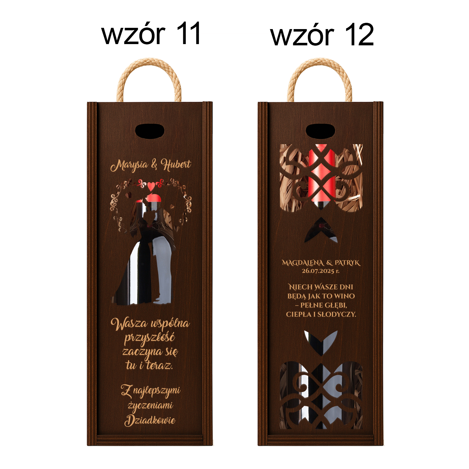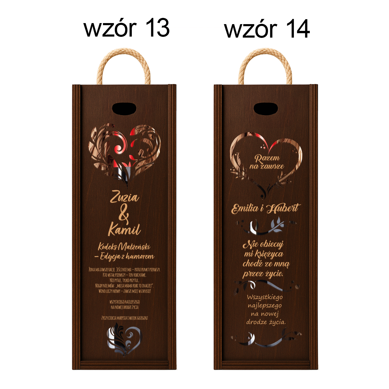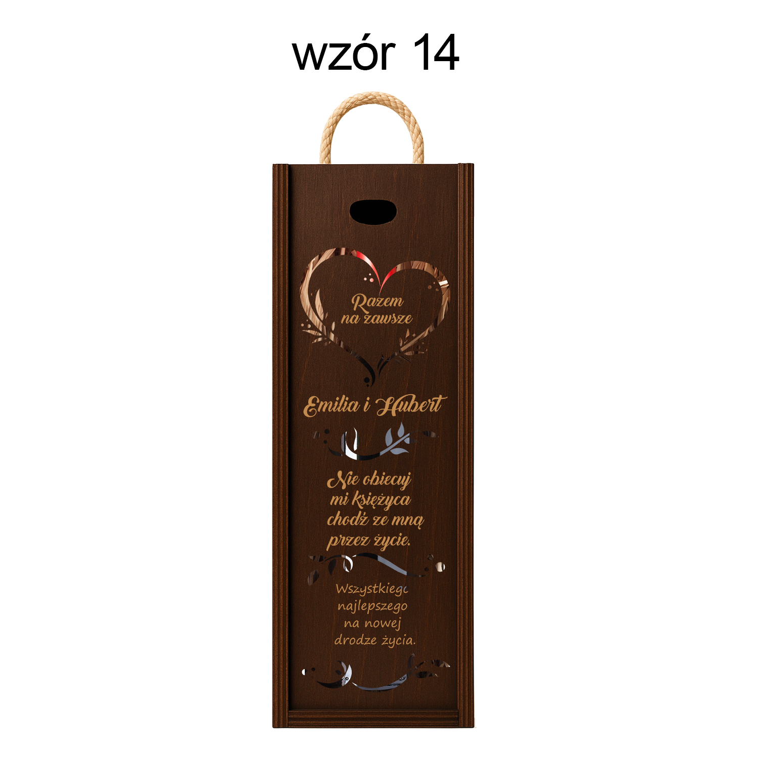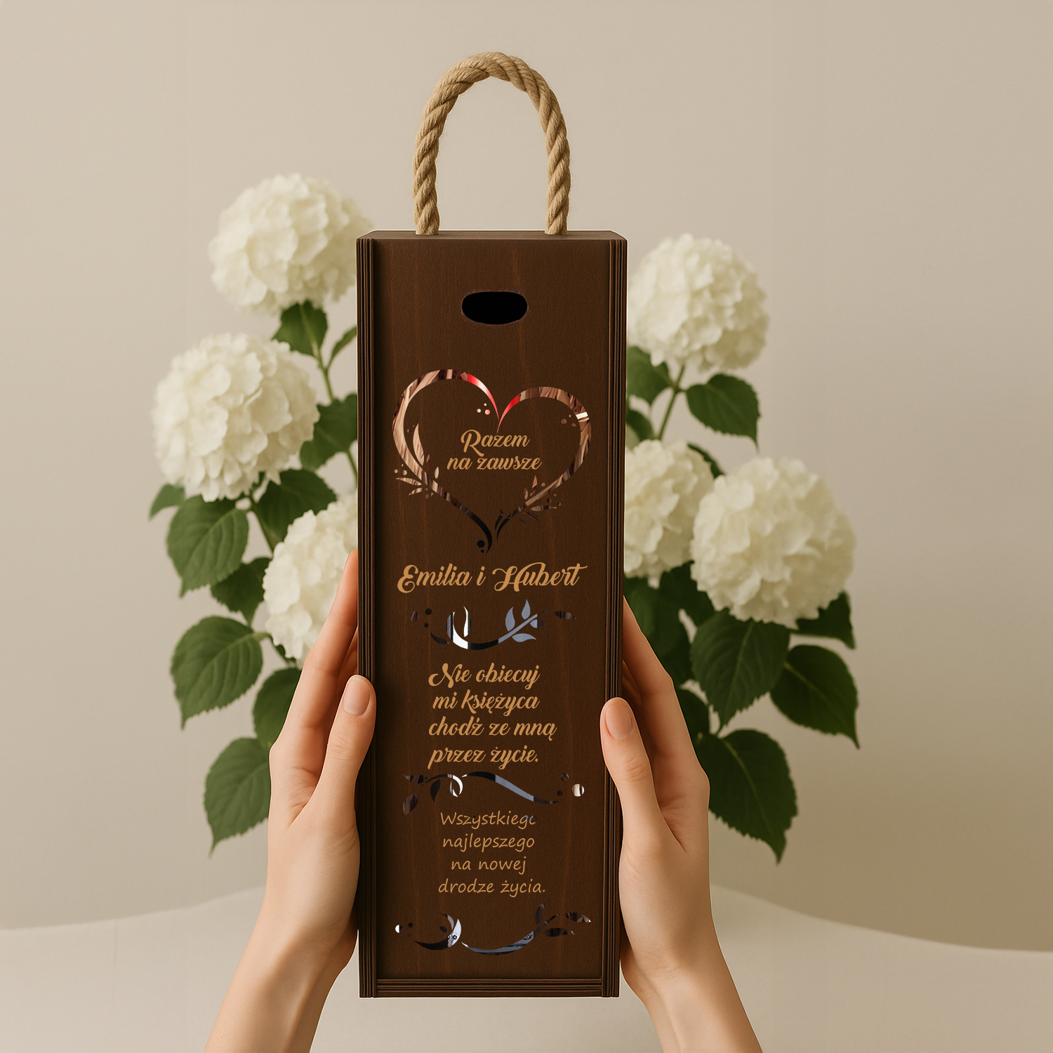 Drewniana skrzynka na wino z ażurowym sercem i grawerem „Razem na zawsze”. Personalizowany prezent ślubny z imionami i romantycznym wierszem.