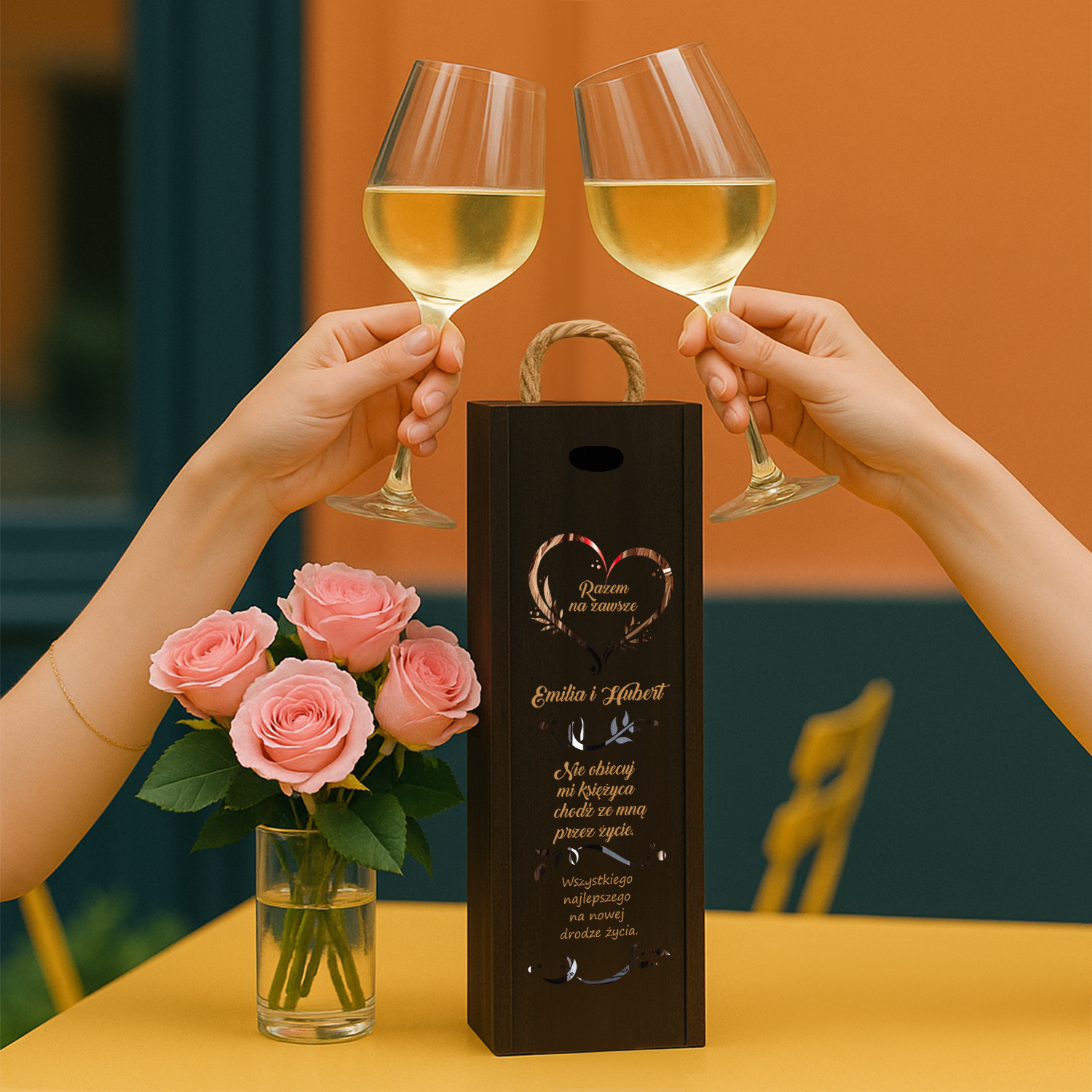 Skrzynka na wino „Razem na zawsze” to wyjątkowy prezent, który mówi więcej niż tysiąc słów. 💗 Łączy klasyczny styl z emocjonalnym przesłaniem. Świetnie sprawdza się jako dodatek do wina, ale również jako samodzielna pamiątka. Dzięki personalizacji – będzie to coś naprawdę osobistego.