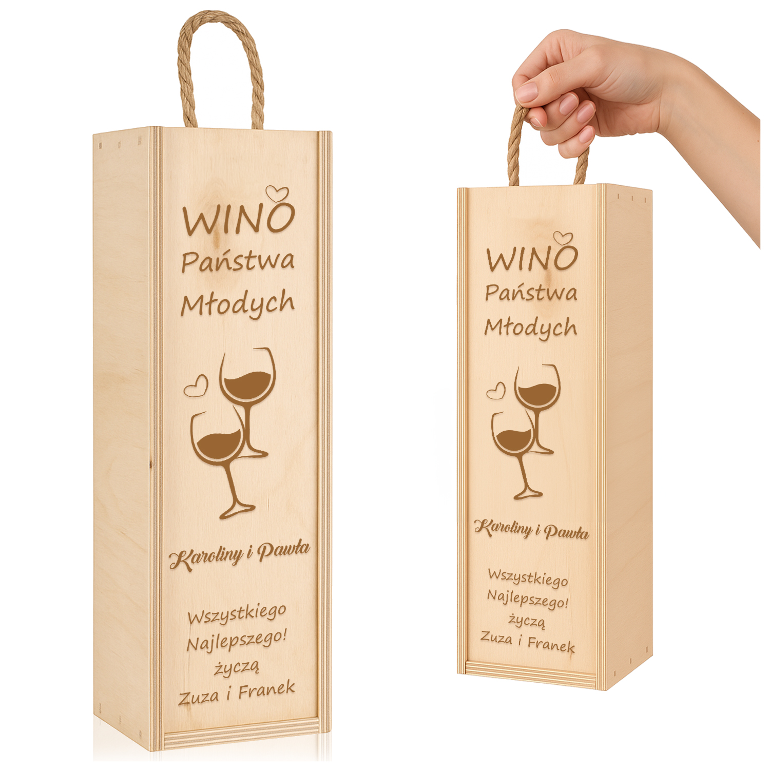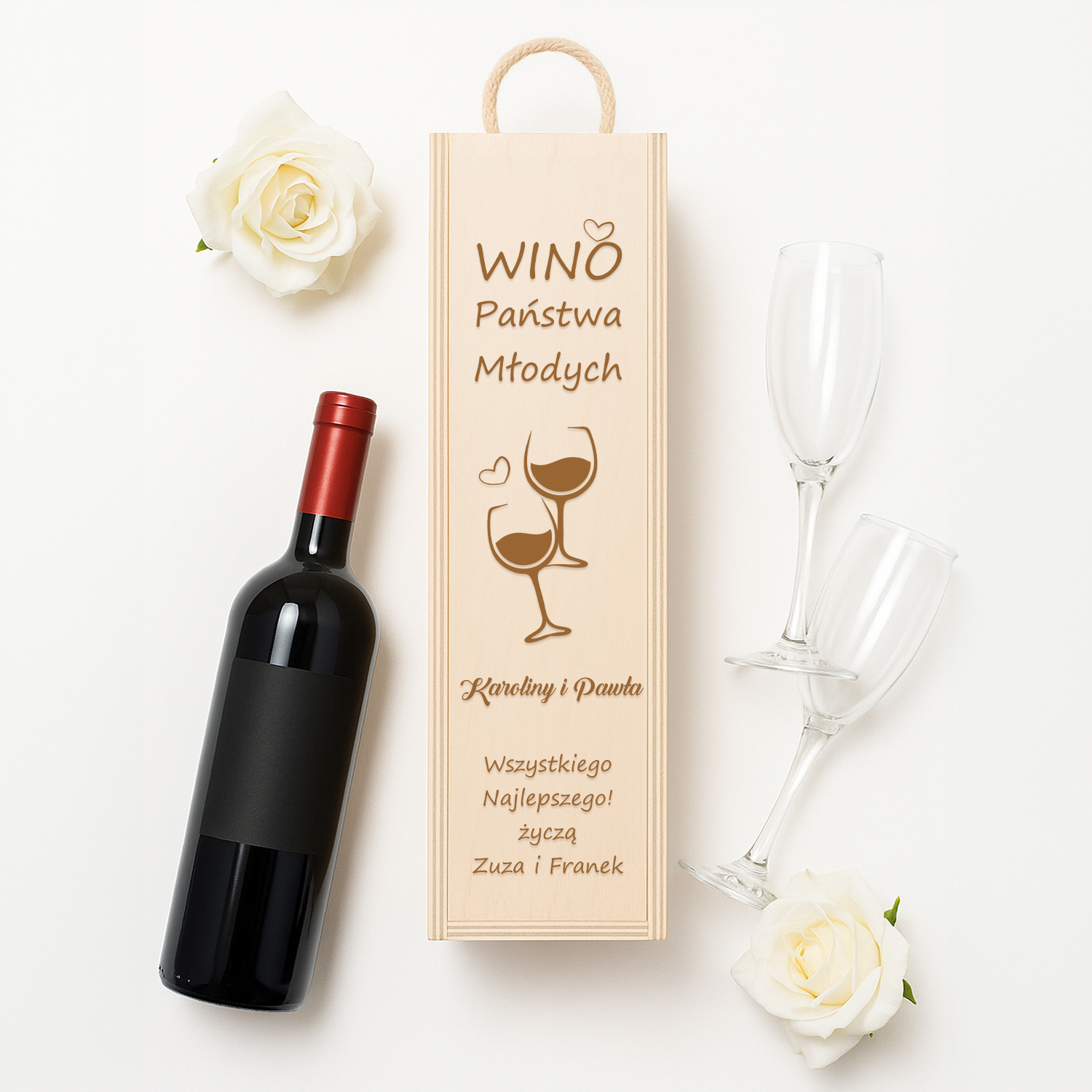 Stylowa skrzynka na wino z grawerem „Wino Państwa Młodych” to oryginalny i zabawny sposób na wręczenie prezentu ślubnego. Motyw dwóch kieliszków oraz personalizowane życzenia sprawiają, że to idealna pamiątka tego wyjątkowego dnia.
