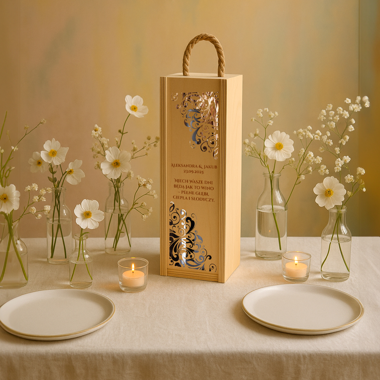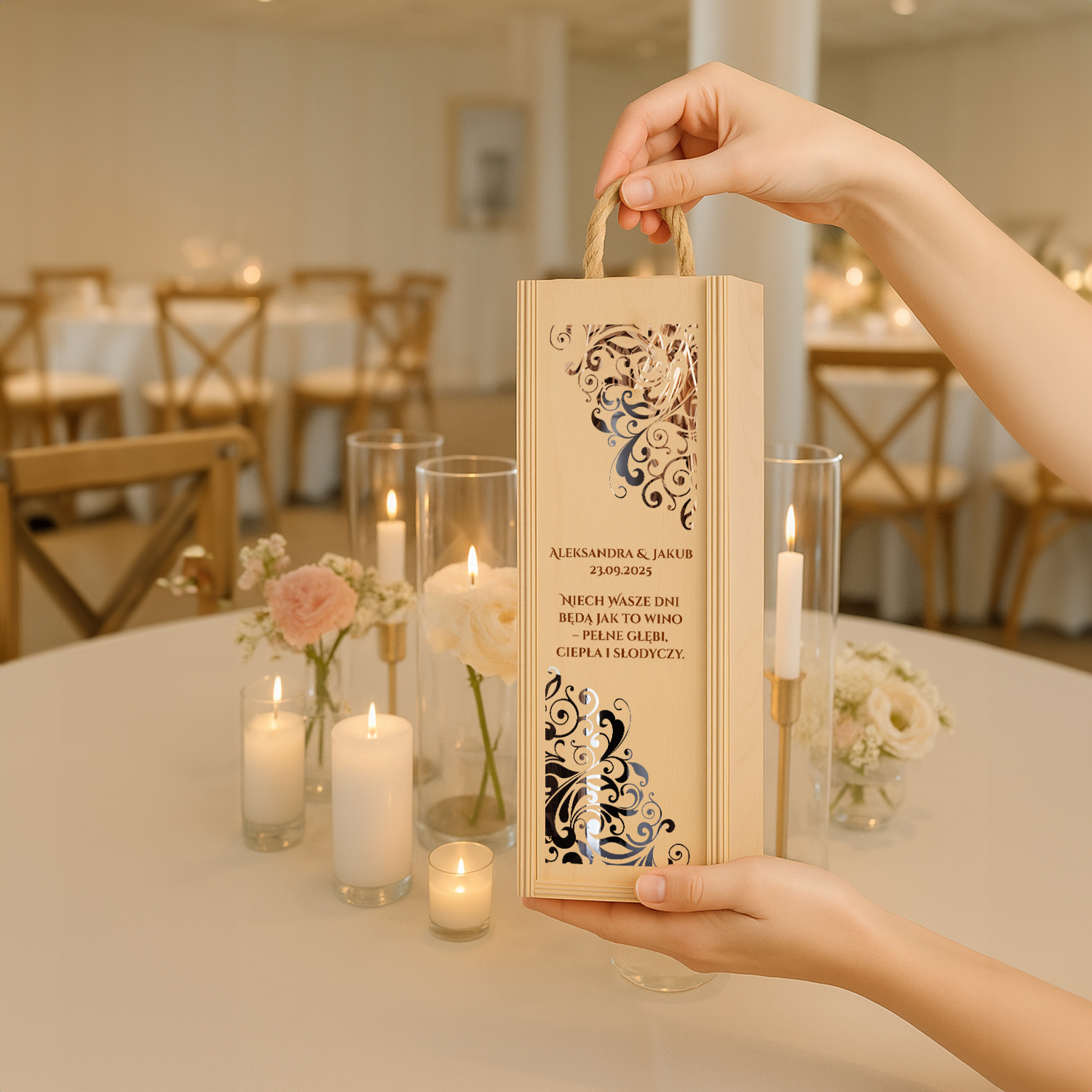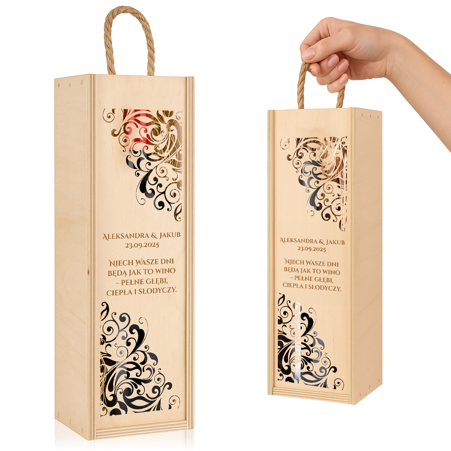 Szukasz stylowego i wyjątkowego prezentu ślubnego? Ażurowa skrzynka na wino z ozdobnym ornamentem to elegancka propozycja, która łączy w sobie klasę, symbolikę i osobisty akcent. Przód zdobi misterny wycinany wzór inspirowany florystycznym motywem, przez który widać zawartość skrzynki – idealnie dopasowana do butelki dobrego trunku.