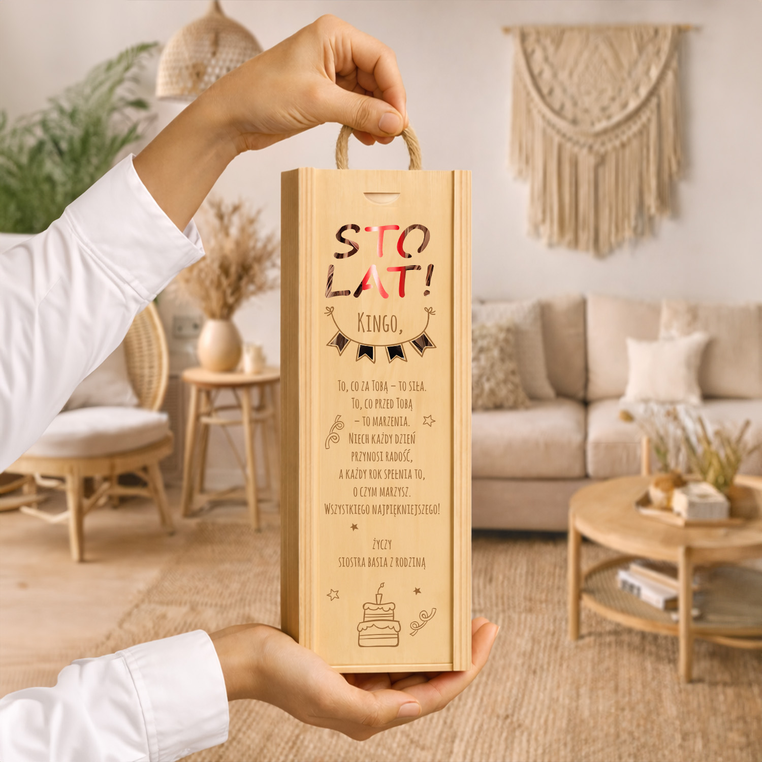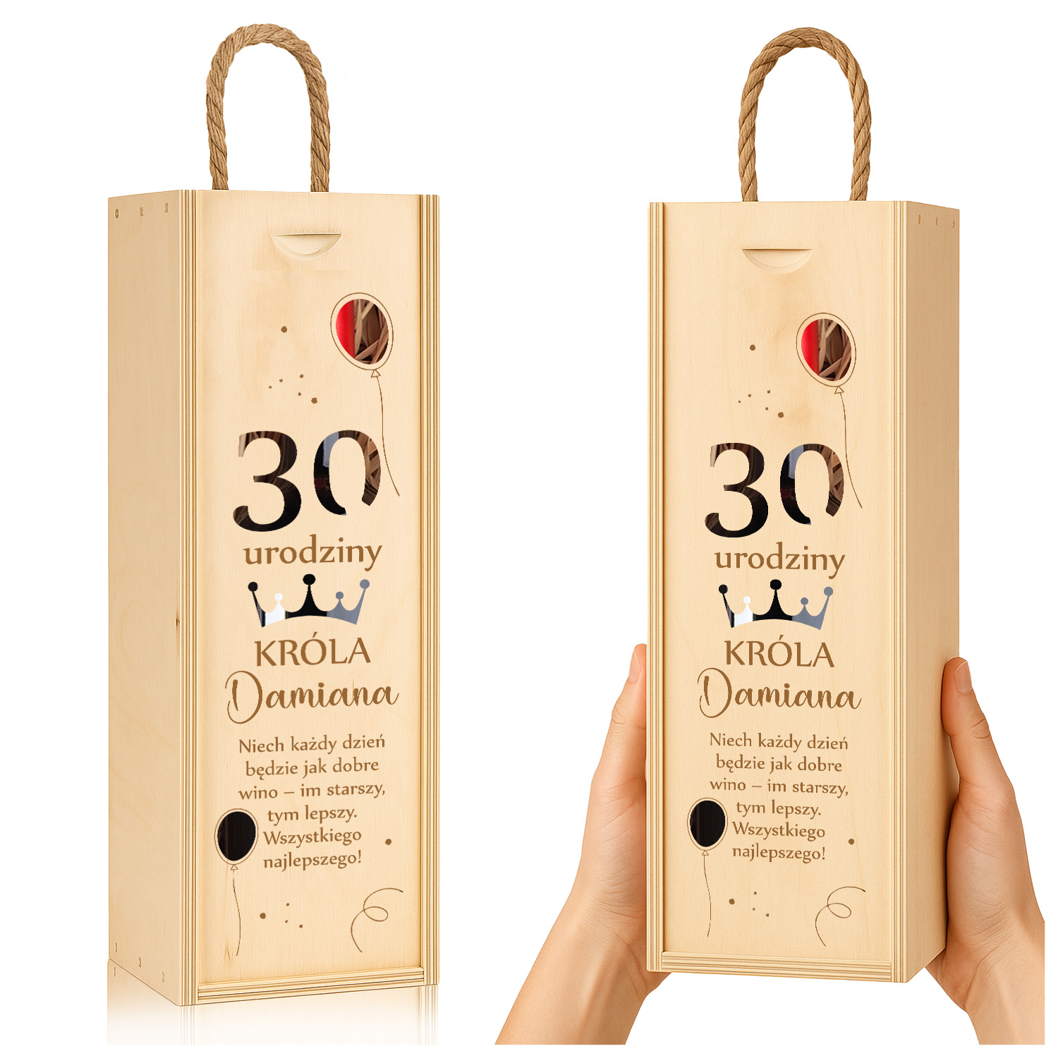 Nasza drewniana skrzynka / pudełko na wino to stylowy sposób na wręczenie butelki wina – niezależnie od tego, czy to 18, 25, 30, 35, 40, 50 czy 70 urodziny