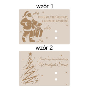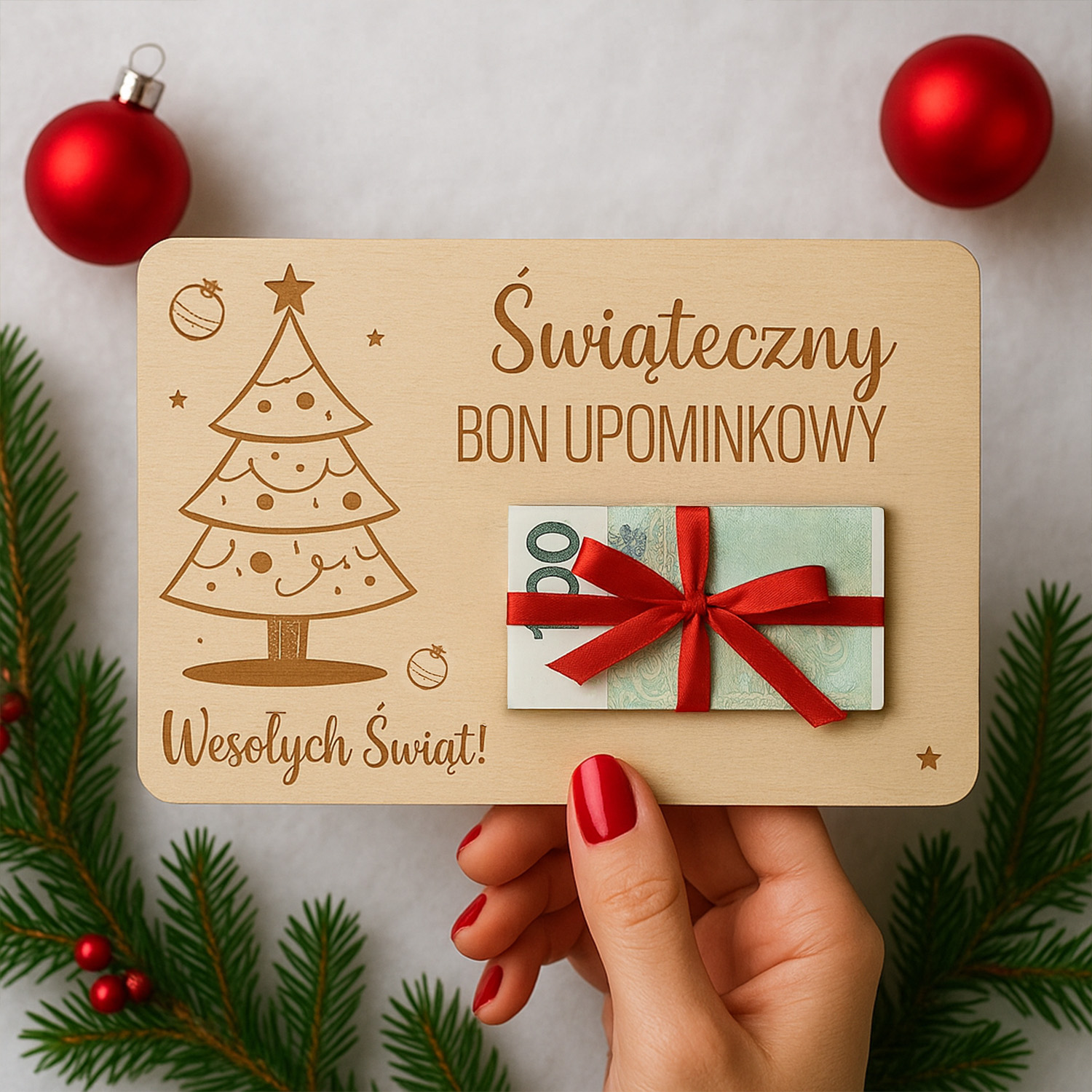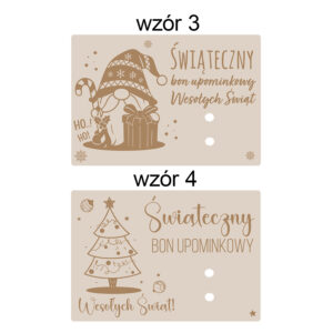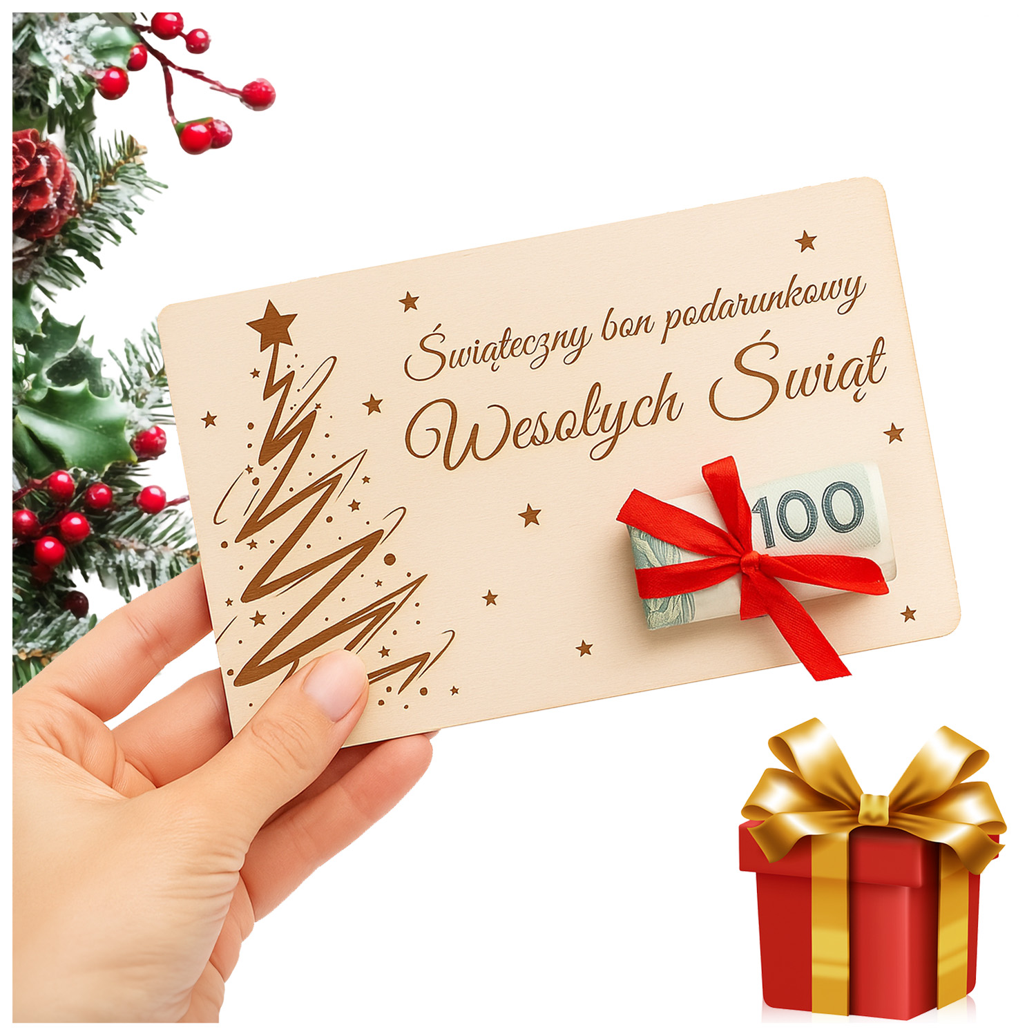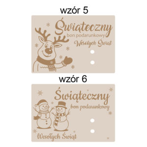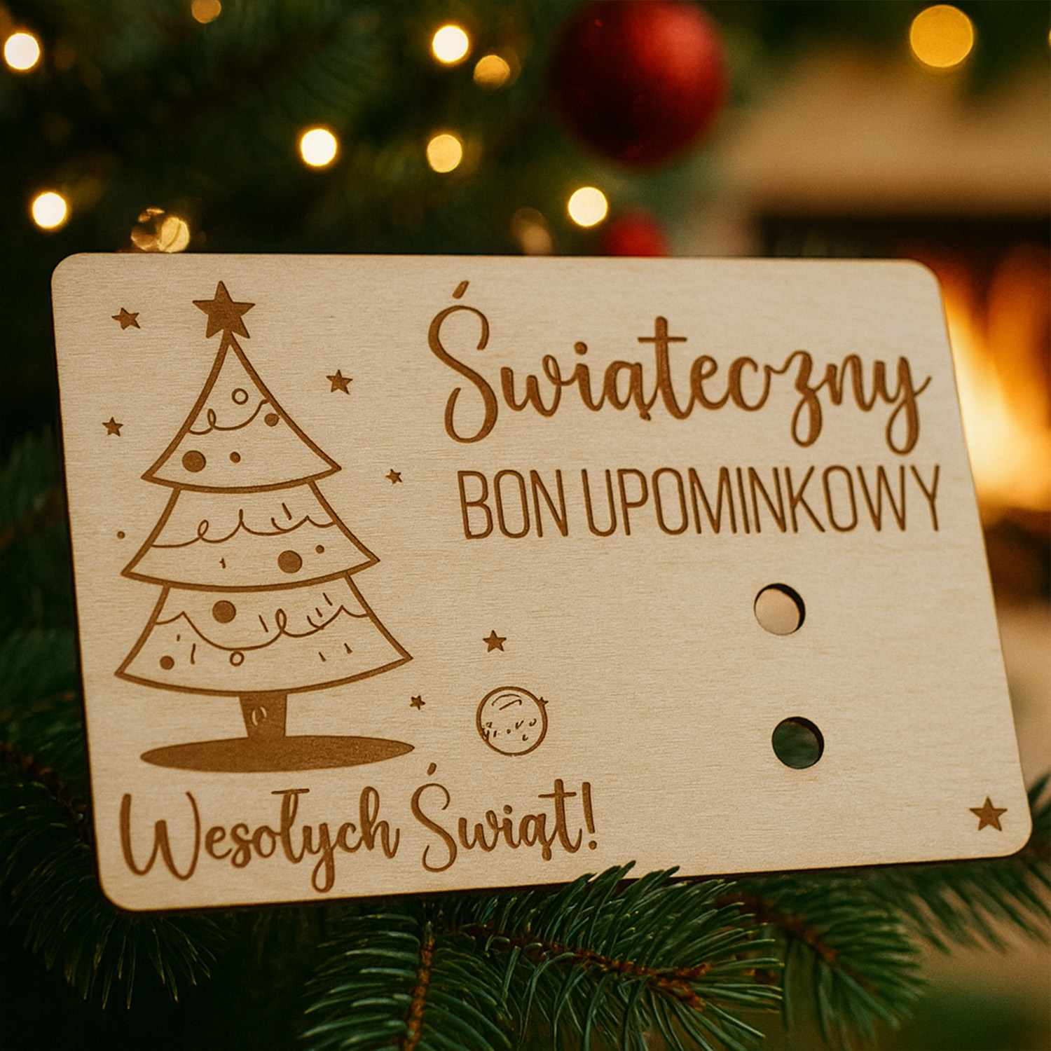 Elegancki drewniany bon upominkowy z grawerem – 6 wzorów świątecznych do wyboru. Wstążka GRATIS, możliwość personalizacji. Idealny prezent pod choinkę!