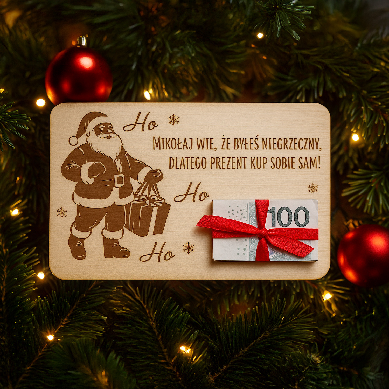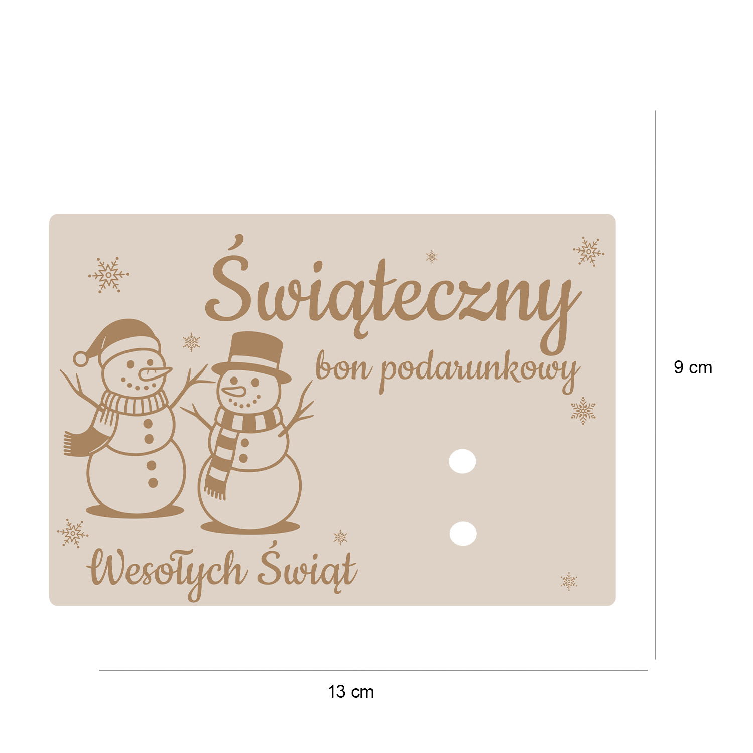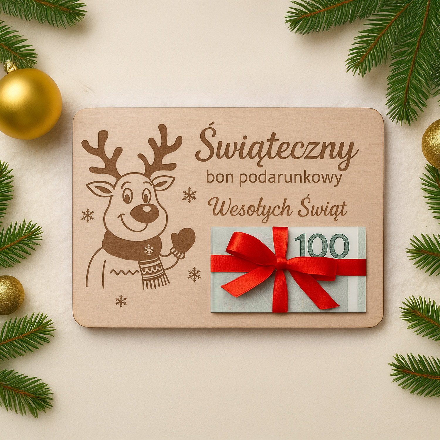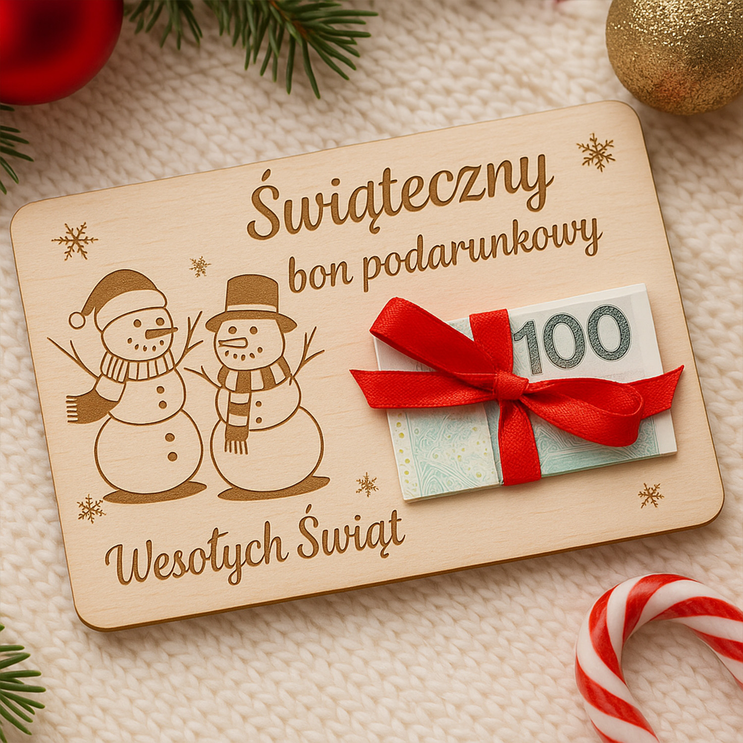 Elegancki drewniany bon upominkowy z grawerem – 6 wzorów świątecznych do wyboru. Wstążka GRATIS, możliwość personalizacji. Idealny prezent pod choinkę!