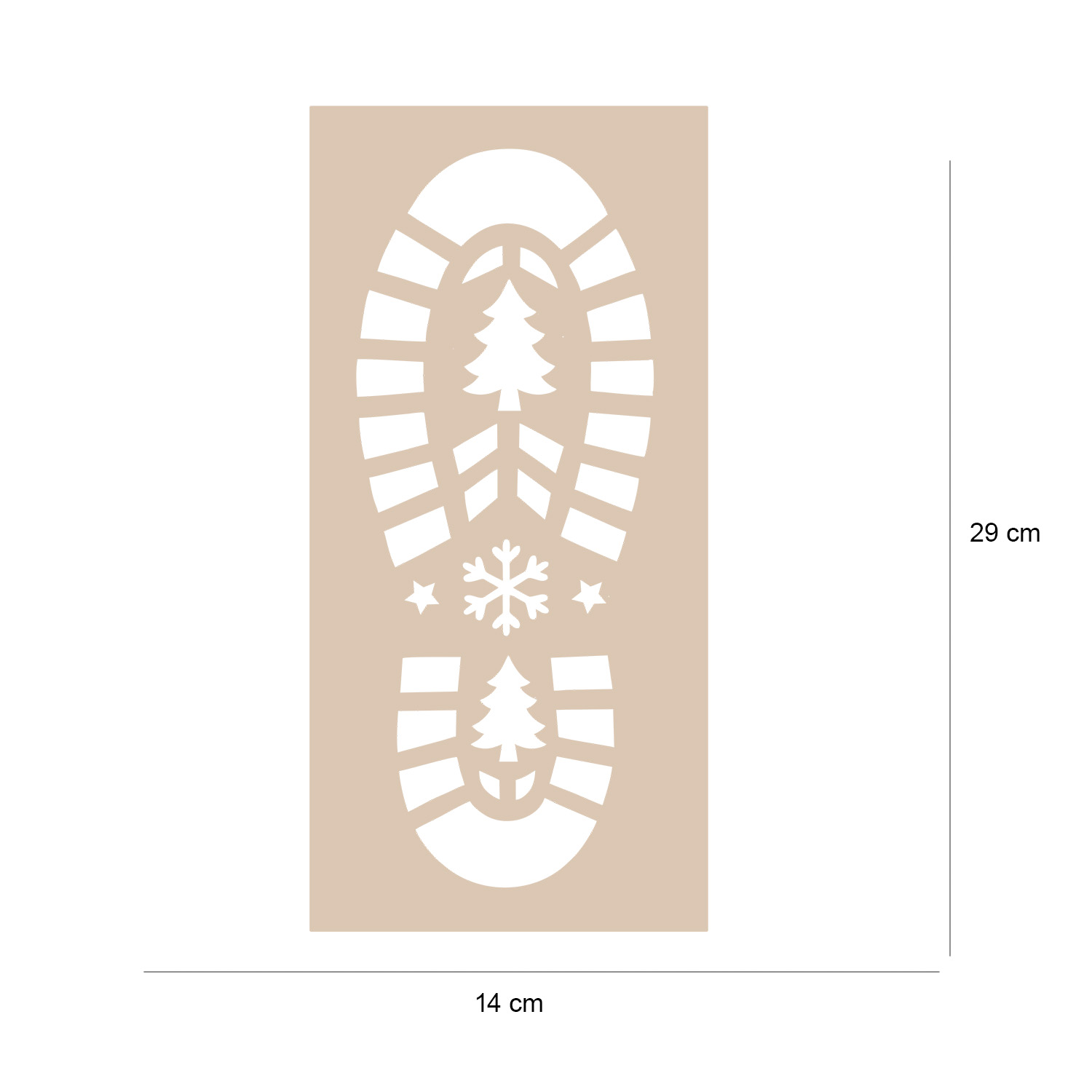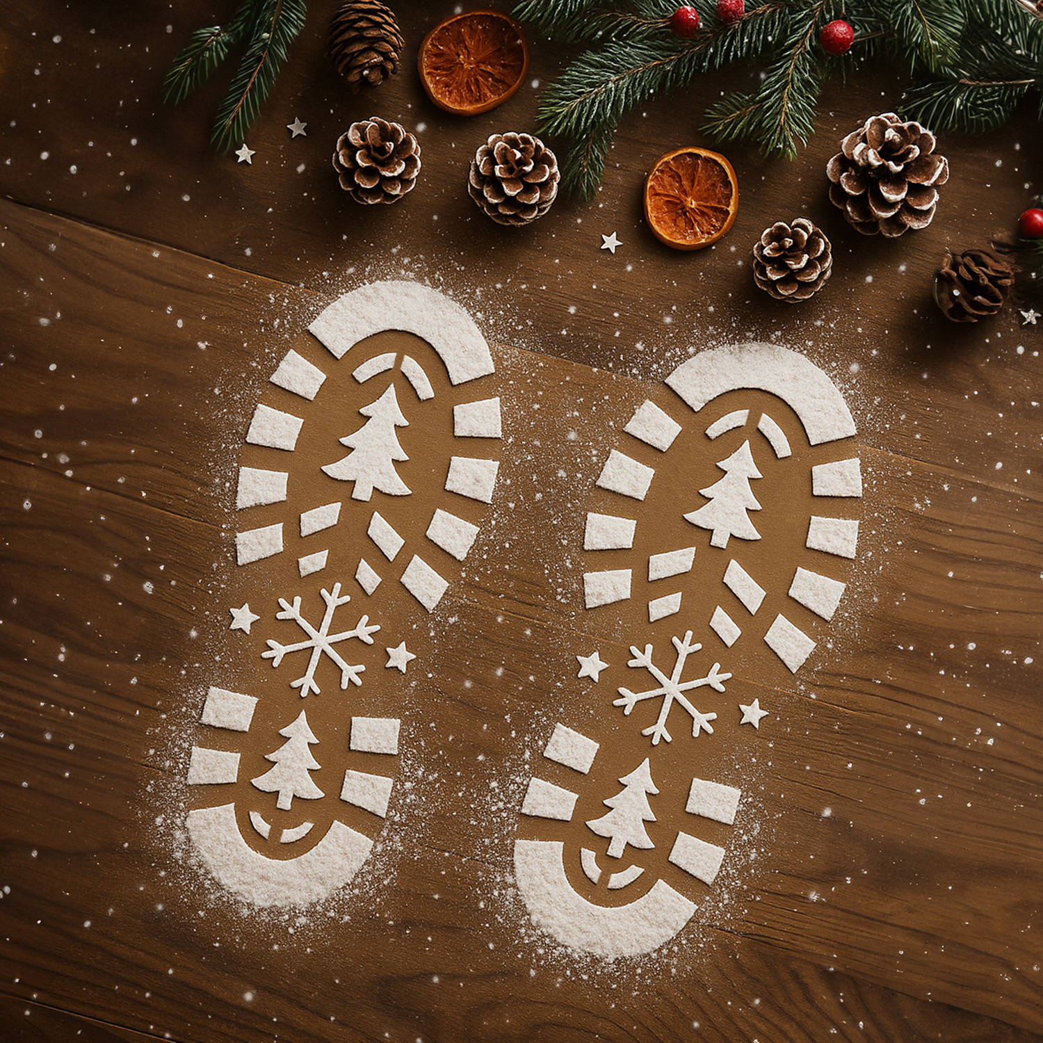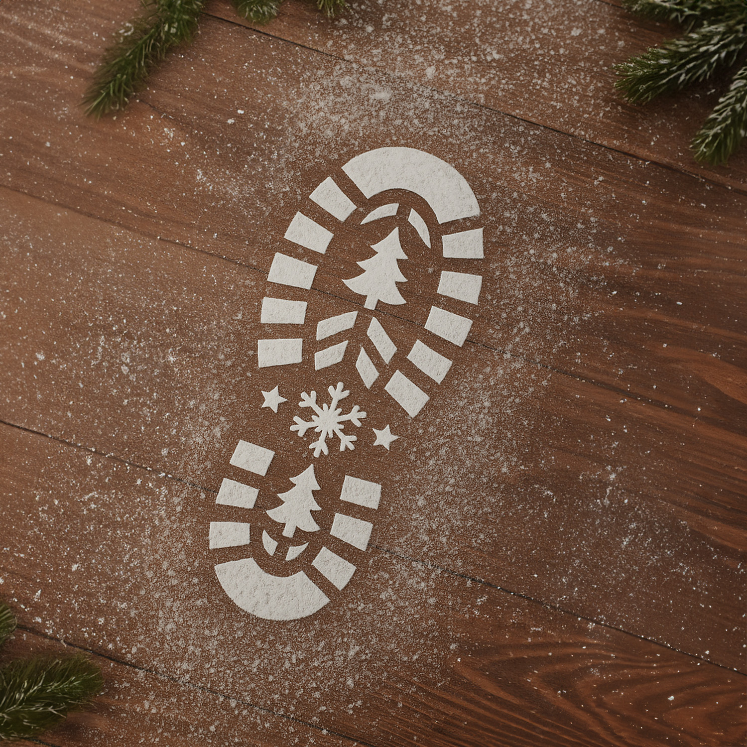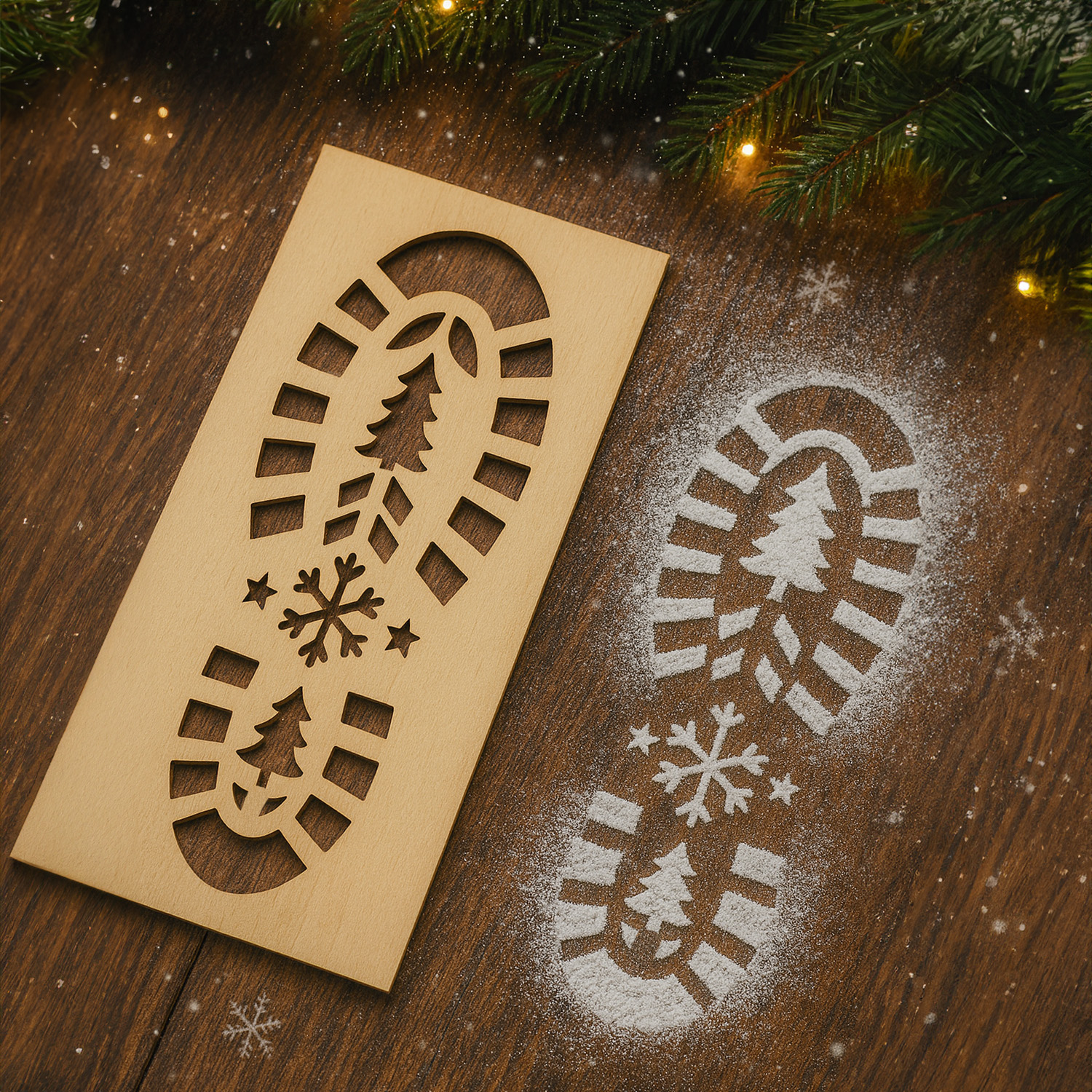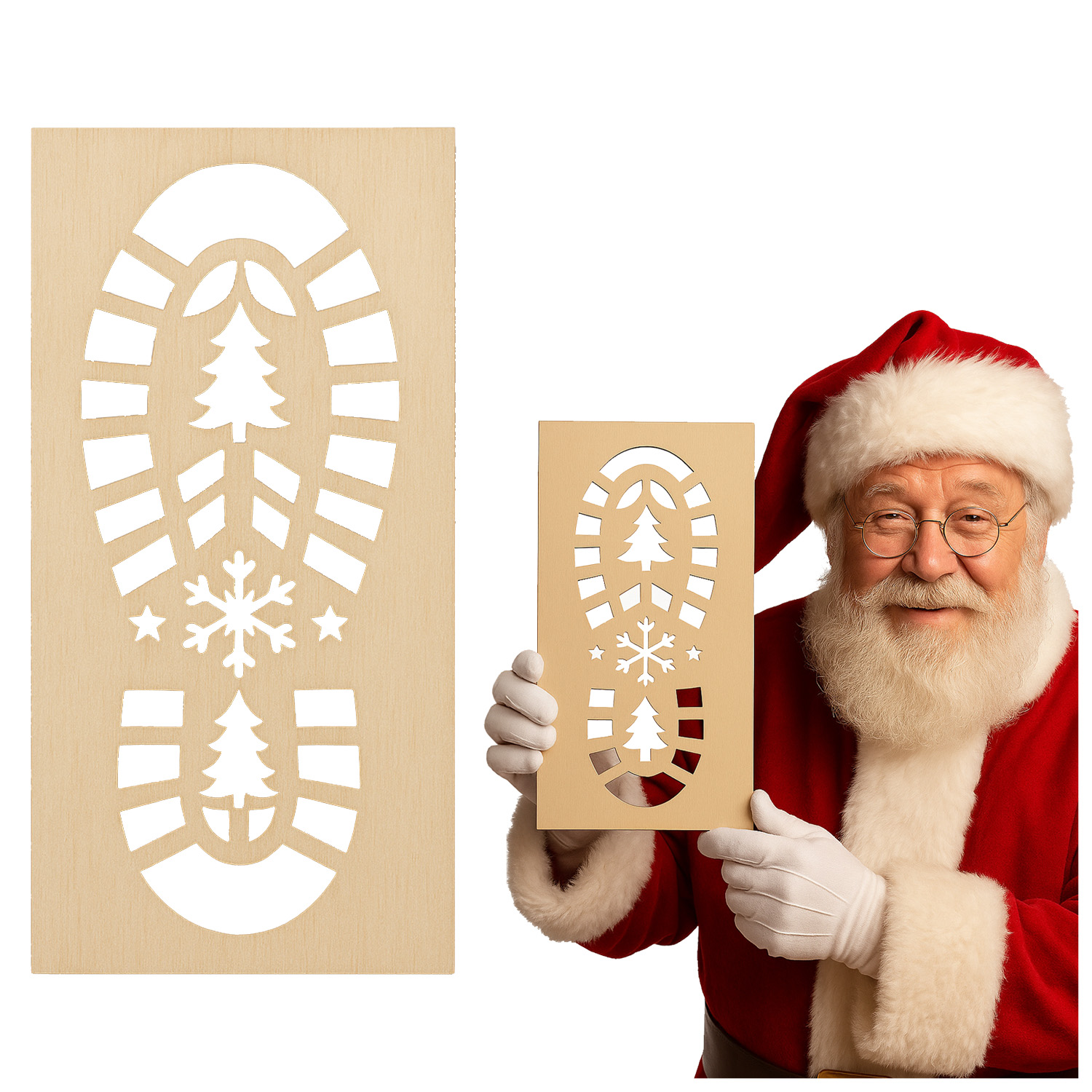 Magiczny szablon do tworzenia śladów Mikołaja! Drewniana forma 29×14 cm, dzięki której stworzysz realistyczne odciski butów Świętego Mikołaja w mące, śniegu lub brokacie. Idealny pomysł na świąteczną zabawę i dekorację domu.